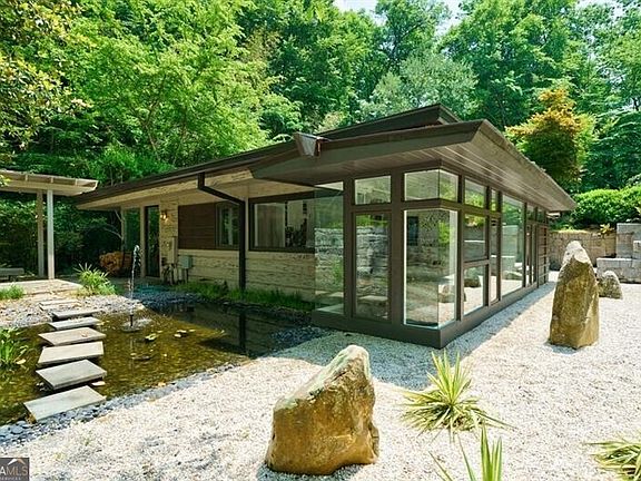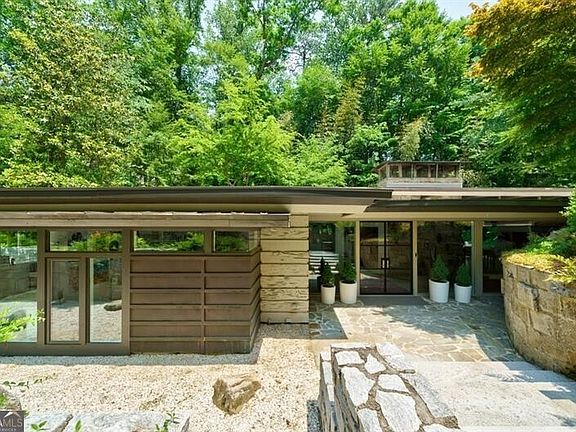 Tucked away on a tranquil and private 2.21 acre lot, this exceptional mid-century modern home offers a rare blend of timeless architecture and serene natural beauty-just minutes from the coveted Chastain Park. Designed to impress, the home features rich pecky cypress accents, dramatic floor-to-ceiling windows, and bold rustic stonework, creating a seamless connection between indoor and outdoor living. The updated kitchen is both stylish and functional, equipped with stainless steel appliances, granite countertops, and a breakfast bar perfect for casual dining. A cozy yet expansive great room centers around a striking stone fireplace and opens to a large deck-ideal for entertaining or unwinding. The dining area, with views of a peaceful creek, sets the tone for relaxed, elegant gatherings. The main residence includes four spacious bedrooms. The private primary suite is a true retreat, offering a spa-like bath with dual vanities, steam shower, and whirlpool tub. Tucked at the back of the home, it also features its own patio and sitting area. A secondary bedrooms are positioned on the opposite side of the primary suite for added privacy, while a separate den and office provide flexible living space. A detached guest house above the four-car garage offers a fifth bedroom and full bath-ideal for visitors, an art studio, or a quiet home office. A rare opportunity to own a distinctive and thoughtfully designed home in one of Atlanta's most desirable neighborhoods, offering unmatched privacy, architectural character, and convenience.