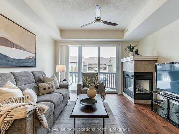 Amenity Rich Lighthouse Point! This 2 bed, 2 bath second floor unit includes a 30 ft Boat Slip, is steps away from the Rec Centre, is being sold partially furnished and has partial views of Georgian Bay from both the living room and primary bedroom! You have to see this one in person to truly appreciate it. This bright, open concept floorplan features modern finishes throughout with stainless steel appliances, eat-in island, plenty of cupboard space, gas fireplace and walk-out through your large sliding door to spacious deck to sit out and relax! Both bedrooms include ceiling fans, neutral colours and the primary bedroom has a bonus 3pc ensuite for your own privacy. The laundry/utility room features a stackable washer/dryer and bonus space to storage additional items. Brand new Air Conditioner as of July 2025. The rec centre offers an indoor and outdoor pool, hot tub, games room, exercise room, party room and has options for everyone! Outside you'll find both Tennis and Pickle Ball Courts close by and a playground for the kids to enjoy. As a bonus, being a boat slip owner allows you access to the marina clubhouse and pool! Use as your full time residence or part time but either way take advantage of this great location with your proximity to Georgian Bay, the Blue Mountain being 10-15 minutes away, private ski clubs, Trail System and everything else this area has to offer.