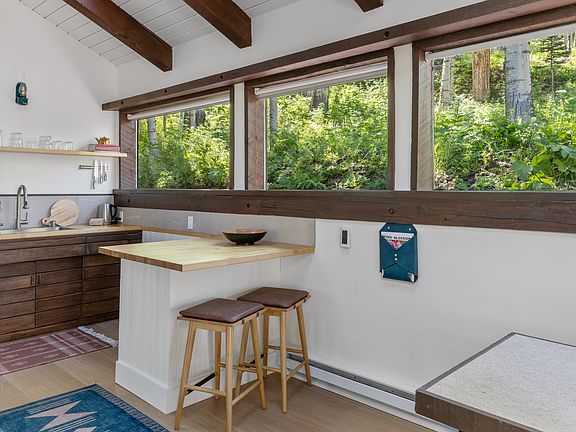 The Master bedroom features a King size bed with premium mattress and linens and spacious high ceilings with views of the trees or stars while laying in bed. Two twin beds available off the master bedroom (flexible sleeping options while max capacity is 2). A small desk is provided as well as two additional closets. Private parking is included (walking up/down steps) as well as snow removal for 2+"