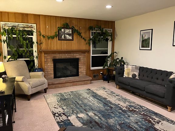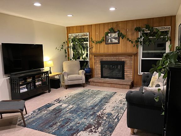 Open living room with a working fireplace, new wood floors, and lots of natural light. Dining area off the shared kitchen. Driveway parking plus additional storage in the carport. Washer and dryer are on the lower level and shared. Close to restaurants, grocery stores, bus stops, parks, multi-use trails, and open space.