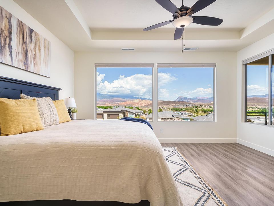 Your dream home is here! With panoramic views inside and out. Located in the desirable Zion Vista community, this home has stunning 180 degree views of Pine Valley Mountain, Coral Cliffs, Kolob, Hurricane Mesa, Zion National Park and overlooks the Hurricane Valley below. Enjoy the tinkling lights of Hurricane City at night. With the primary bedroom on the main floor, you have everything you need without using stairs. In the walk-out basement, you have a second kitchen, 2 oversized bedrooms plus a den, laundry connections and full bathroom, perfect for young adults, mother-in-law or renters. Enjoy the view from the covered deck and well manicured yard, complete with a gas fire pit and hot tub. The garage is setup perfectly to be a shop or extra room, conveniently fitted with a separating wall, door and mini split. Come check this one out before its gone!