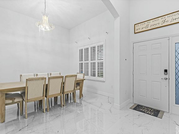Elegant Design: Formal dining room, plantation shutters, soaring 14-foot ceilings, and impact glass throughout.