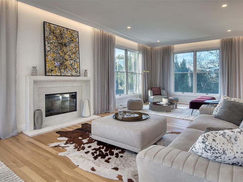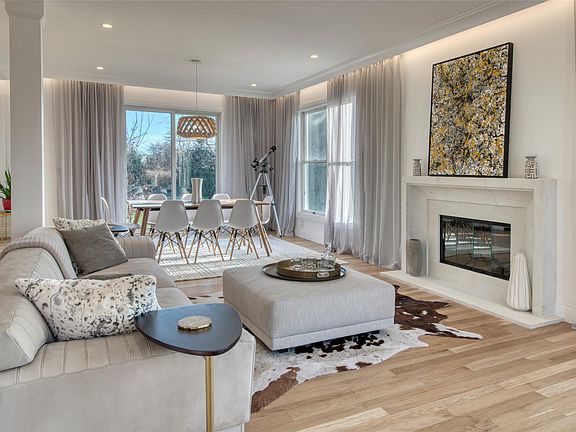 The interior has been completely transformed with all-new electrical systems, solid-core doors, and oversized new windows that flood the space with natural light. Thoughtfully redesigned, the main level includes a bedroom with dual large closets and ceiling fan, two stunning full bathrooms, and custom-built closets for coats and shoes. A new mudroom with custom cabinetry, detailed moulding with LED lighting, and a barn door separating the laundry room adds both function and flair. The laundry room features custom cabinets that mirror the kitchen’s finishes for a cohesive, high-end look. The inviting living space includes a wood-burning fireplace and recessed lighting throughout, creating a warm and welcoming environment.