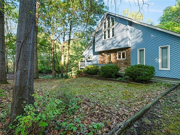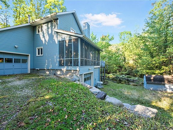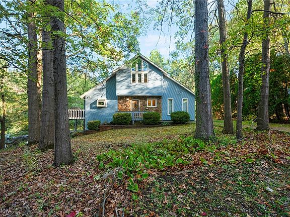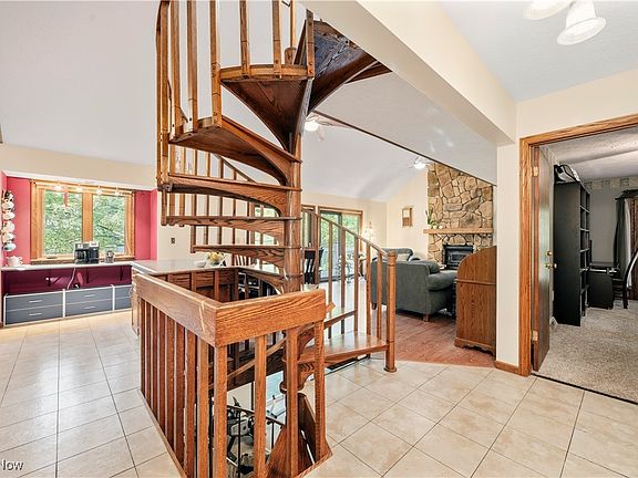 Nestled among the trees in the desirable Knollwood neighborhood of Tallmadge, this charming chalet-style home offers a one-of-a-kind blend of character, comfort, and natural beauty. Step inside to an open floor plan where the kitchen flows seamlessly into the great room—highlighted by a striking stone fireplace with a wood-burning stove, perfect for cozy evenings. A first-floor bedroom or office features a full bath and laundry nearby, along with access to a large screened-in porch—ideal for morning coffee or quiet relaxation. From the main-level deck, take in tranquil views of the private pond and wooded surroundings. A spiral staircase takes you upstairs where you'll find a loft walkway overlooking the great room and two additional bedrooms and full bath. The lower level adds even more living space with a large rec room/family room, perfect for games, movies, or gatherings, and includes a third full bath. Walk out to the concrete patio to enjoy peaceful water views and the sights and sounds of nature. With two single-car garages, a private yard tucked into a serene corner of the neighborhood, and wildlife that visits at dawn and dusk, this home offers the best of both worlds—peaceful retreat living with close proximity to shopping, parks, and all that Tallmadge has to offer. Come visit today!