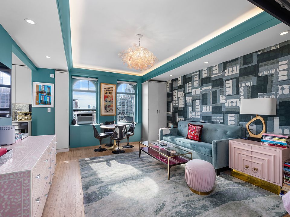 FURNISHED RENTAL. Perched on the 16th floor of the iconic London Terrace Towers at 465 West 23rd Street, Apartment 16i, an exquisitely renovated South facing alcove studio residence with sectioned off alcove bedroom. Thoughtfully and creatively designed, this space blends classic pre war with modern luxury. From the moment you enter the entry gallery, with its Andy Warhol wallpaper and huge art deco mirror, you immediately notice how unique, charming and sophisticated this space feels. Enhanced by three arch designed windows, you cannot help but gaze at the vast city views, including the World Trade Center, highline and the Hudson River. Sunsets are a bonus. Night or day, the views are spectacular and the natural sunlight is abundant. If you would prefer not to have the sun streaming into the apartment, there are custom remote operated window shades.