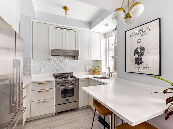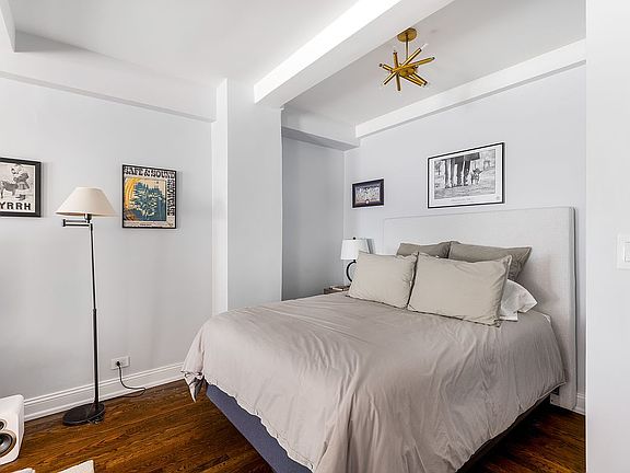 This spacious studio offers a flexible layout that easily accommodates living, dining, sleeping and home office areas. Beamed ceilings rise 9 feet high over beautiful hardwood floors, chic designer lighting and east-facing windows, creating a bright and airy ambiance throughout. The gracious foyer welcomes you into the large living space and queen-size alcove sleeping area. The open chef's kitchen impresses with contemporary custom cabinetry, quartz counters and stylish herringbone marble backsplashes. The upscale stainless steel appliances include a vented Bertazzoni gas range, dishwasher and built-in microwave. An oversized walk-in closet finished with an Elfa closet system neatly organizes even the largest wardrobes. A classic black-and-white full bathroom completes this wonderful West Chelsea home.