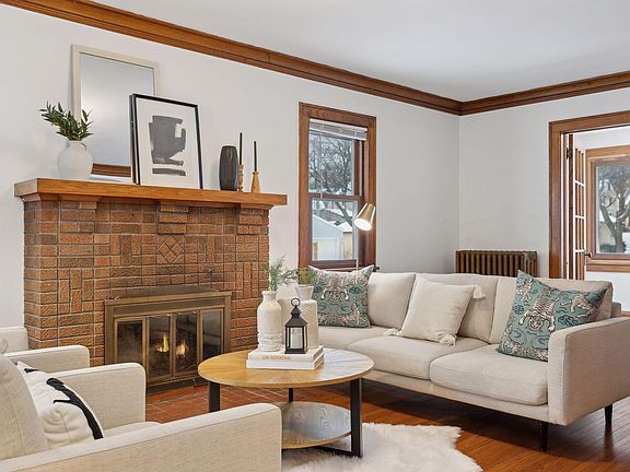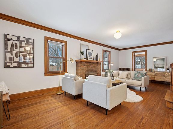 Charming center hall colonial just two blocks from the parkway, steps to restaurants, coffee shops, Hiawatha Golf Course, and Lake Nokomis. Features a formal living room with a wood-burning fireplace, crown molding, and hardwood floors, plus a bright sunroom and formal dining room with a built-in buffet. The large eat-in kitchen boasts new quartz counters, new stainless steel appliances, updated lighting, and flooring. Refinished hardwood floors on the main level. Lower level offers potential for additional living space. All 3 bedrooms and den/office on upper level. Two-car garage. Recent updates: new roof, appliances, fresh paint, boiler, and water heater (2018).