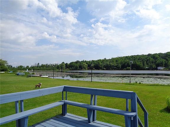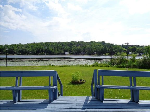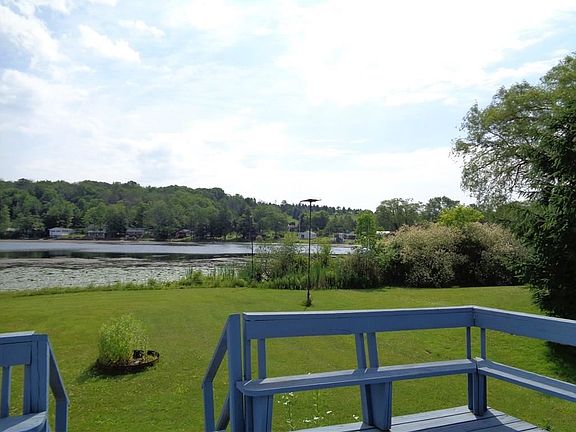 Great opportunity to own a house on the water! Loucks Pond is very quaint and picturesque. This year-round house has 3 bedrooms, 1 full bath and a nice open level lot. Large kitchen w/ lots of storage, side-by-side fridge, upright freezer, stove, microwave, countertop toaster oven and toaster all stay and are next to the dining room w/ coal stove. Large living room w/ waterfront views and sliding glass door leads to the newly painted deck for outdoor entertainment. The large barn structure is actually a garage, second floor storage and even has a covered side porch. Furnace 2017. Washer included. This is an estate therefore being sold "AS IS".