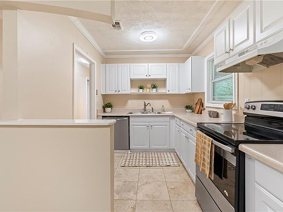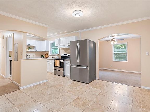 Attached carportFlexible livingStainless-steel appliancesCrisp white cabinetsBright kitchenVersatile front room