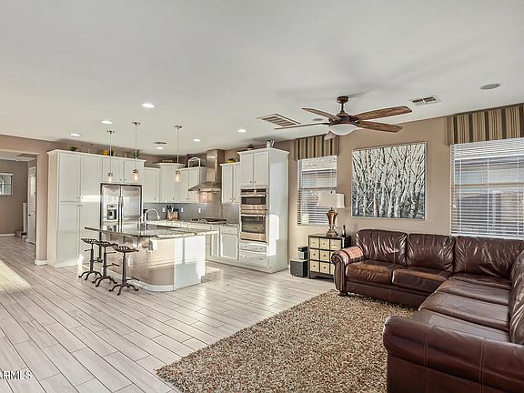 Discover the epitome of modern living in this stunning two-level residence located in the coveted Eastmark Community. The exterior impresses with its 3-car garage, elegant pavers, and a charming front patio, setting the stage for a warm welcome. Step inside to an airy and luminous living room adorned with wood-look tile flooring, surround sound, and ceiling fans. The versatile den/office with a stylish barn door adds a touch of character, while dual pane windows enhance the home's energy efficiency. The expansive great room features sliding glass doors that seamlessly connect to the back patio, perfect for entertaining or relaxing in your private outdoor space.