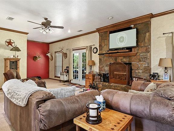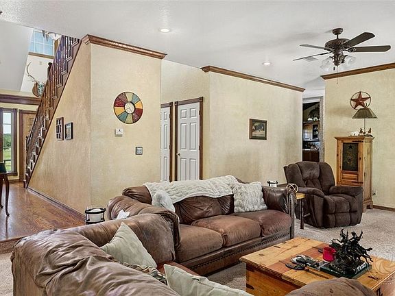 Absolutely breathtaking 40 acre Ranch!! Large entrance, pipe fencing, and asphalt driveway bring you right up to this beautiful 2 story home. You will fall in love with the rock, brick, and cedar mix! Home features 4bd/3ba, granite counter, ss appliances, custom wood ceilings and so much more. Beautiful outdoor entertaining area with salt water pool. 40x60 horse barn with 5 stalls, tack room, and wash bay. Outdoor arena with electric and irrigation on the front acreage. This is one show stopping property!
