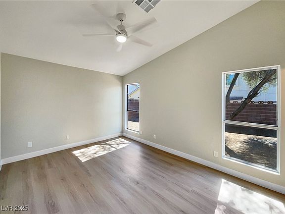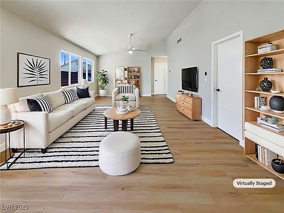 Welcome to this beautifully renovated east Las Vegas home! The interior boasts a neutral color paint scheme, fresh paint, and new flooring throughout, creating a clean and modern atmosphere. The kitchen is a chef's dream with stone counter tops, a stylish accent backsplash and stainless steel appliances. The exterior of the home has been freshly painted, enhancing its curb appeal. The property also features a fenced-in backyard and patio, perfect for outdoor activities or simply enjoying a peaceful afternoon. With its new appliances and tasteful updates, this home is ready for you to make it your own. This home has been virtually staged to illustrate its potential.