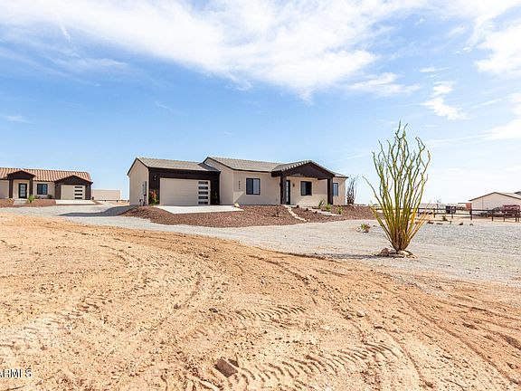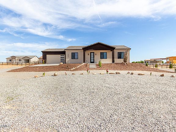 Fantastic opportunity to own this newly-constructed home on a sprawling 1-acre horse property! You're greeted by a 2-car garage and a low-maintenance desert landscape. Fall in love with the captivating great room with high ceilings, recessed lighting, blinds, durable tile flooring, and an inviting fireplace for cozy evenings. The gourmet kitchen boasts quartz counters with a matching backsplash, white shaker cabinets with crown moulding, chic pendant lighting, stainless steel appliances, a pantry, and an island with a breakfast bar. The luxurious primary bedroom showcases an ensuite with a lavish raindrop shower, a soaking tub, and a walk-in closet. You'll be delighted by the detached guest house, complete with a great room with a second fireplace, a fully-equipped kitchen, two beds and baths, and an attached garage. Venture out onto the expansive outdoor space, which offers covered patios, breathtaking panoramic views of the desert and surrounding mountains, and abundant space for crafting your dream oasis. Don't miss out on this incredible gem!