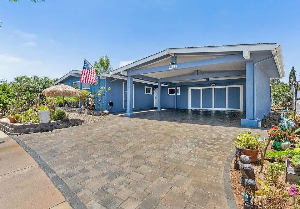 Discover the epitome of an extraordinary location that everyone seeks. This stunning home is just a 5-minute drive to the 52, I-5, and 805 freeways, as well as the beaches, and only 10 minutes from the airport. Nestled in a serene cul-de-sac, this property offers peace and tranquility. Situated on approximately a quarter-acre canyon lot, this home boasts beautiful natural views with lush greenery, with many fruit trees such as Apricot, Orange, Cherimoya, Lemon, Peach and Avocado. Also a putting green, and even a she-shed. The entrance features a newly built, spacious carport that can accommodate four or more cars, with beautiful pavers extending to the backyard. Inside, you'll encounter a welcoming fireplace, a cozy dining area, and a large kitchen. The east wing of the house offers two bedrooms and a bathroom, while the west wing presents an oversized Primary bedroom with a pull-out Murphy bed and a walk-in shower. This wing also includes a second upgraded kitchen featuring attractive wood cabinets and an electric glass top oven range. Additionally, the home includes a spacious laundry room. Enjoy significant savings on your electricity bill with several top-of-the-line solar panels installed. The backyard is an outdoor oasis, with a large coral tree providing shade to much of the area. You can also access the rooftop to enjoy the lush canyon views and relax in the open space. This wonderful home combines convenience, natural beauty, and modern amenities, making it the perfect place to live.