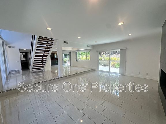This stunning South of the Boulevard modern home offers 4 Bedrooms and 2.5 baths with a completely remodeled interior. It is tucked away in the highly sought after neighborhood North of Mulholland Drive and East of Topanga Canyon Blvd and it offers nearly 2400 square feet of living space on a spacious tiered lot. Enter the home through the statement piece modern front door and notice the sleek tiled downstairs and the sunning cabled stairwell. The step-down living room boasts a granite fireplace from floor to ceiling. The kitchen features sleek cabinets and stylish quartz countertops and backsplash, stainless sink, a stainless range with high flow ventilation hood and a black dishwasher. The kitchen is open to the dining area and large living room. There are 2 large dual pane sliders in the living area which open into the private rear yard. Downstairs there is a bath. Upstairs you will find the primary suite which opens to a huge resort-like balcony. The primary bathroom has an amazing Kohler Greek tub with glass walled shower, dual sinks, quartz countertop, floating mirrors, modern fixtures and floor to ceiling tile, along with a walk-in closet. The secondary bathroom upstairs features floor to ceiling tile, tub with splash guard and modern shower fixtures. The 3 additional bedrooms all feature large closets with mirrored wardrobe doors and blinds. There is also a walk-in closet in the hallway for additional storage. There is recessed lighting and dual pane windows and doors throughout. There is a large laundry room with storage cabinets, sink and washer/dryer hook-ups with direct access to the enclosed 2 car attached garage. This home's prime location places it near Woodland Hills Country Club, and within minutes from The Village in Woodland Hills. It is just a drive through the canyon to Topanga Canyon and the beaches in Malibu. A gardener is provided. This is a non-smoking property. Submit for a small pet. Pet is subject to homeowner approval with additional deposit.