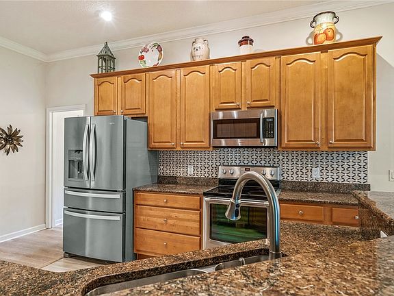 LAKEFRONT 3/3 + den showcases fabulous sunsets! Pride of ownership! Roof 2022, new impact windows, portable home generator, partial repipe. Open concept w/updated kitchen, legacy cabinets, New refrigerator, range & washer, dryer! Granite counters! Wood-look floors, plantation shutters, high ceilings, fans in all rooms. Spacious tiled porch w/room for pool. LOW HOA $85/mo, irrigation well. Charming curb appeal, no gate for ease. Motivated seller relocating—priced aggressively! (sizes approx)
