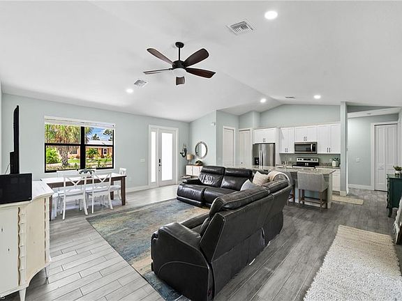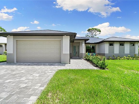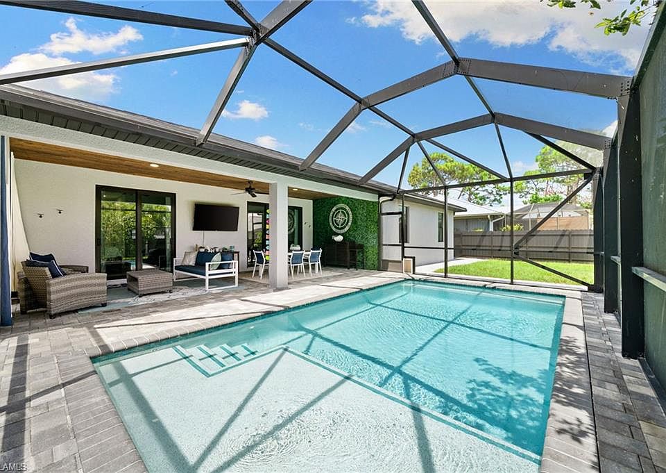 BETTER THAN NEW - This newer construction, Southern Facing POOL home features attractive upgrades and is move-in ready with upgraded pool/sundeck, fully fenced with privacy landscaping and cordless blinds and beautiful window treatments. Could be purchased turnkey ready for seasonal/airbnb rental or a great full time residence. A standout feature on this home is the fully integrated Tesla solar roof - FPL bill of $25-30 a month with NO LEASE FEE. Huge savings even with the pool heater running! Inside features vaulted ceilings, ample natural light, great room floorplan and large island for entertaining. Porcelain wood-look plank tile runs throughout the entire home. The kitchen boasts white shaker cabinetry, granite countertops, and stainless steel appliances. All windows and doors are high impact hurricane rated and extremely energy efficient as well. The master en-suite is a retreat with double walk in closets and a dream bathroom with statement making floating tub and separate shower, with dual sinks and extra linen storage. The outdoors are a great escape, with oversized covered area spacious enough for lounging and dining spaces, custom wood ceiling, upgraded salt water pool with sun deck and pool heater, and a bronze aluminum fence. Even a built in dog door for your furry friend from the screen cage to the spacious yard. Three additional large guest bedrooms with room for king beds complete the space. Property is high and dry and faced no flooding during Ian or any storm! This community is prime for flexible rental policies as well as full time living. Centrally located a mile to Coconut Point, the new Ritz Carlton Residences and waterfront dining/shopping boardwalk, as well as a close drive to popular amenities and 20 min to RSW Airport. SELLER FINANCING AVAILABLE - 5% INTEREST WITH 25% DOWN - 3-5 YEAR BALLOON - CANT BEAT THESE TERMS!!