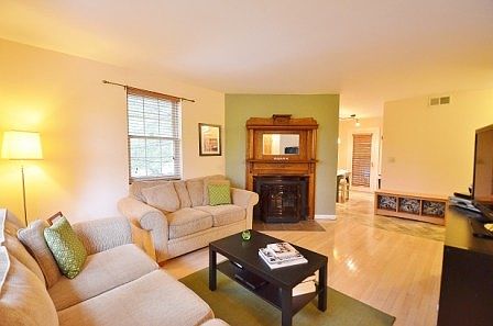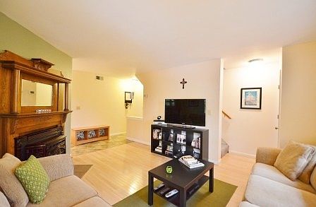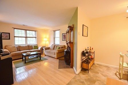 Most convenient Location and surrounded by Trees!! 2 Lvl End unit, Balcony "in the woods". Kitchen updated, Cabinets & Corian Counters & SS Appl. Living Room, real wood floors & a Pellet Stove insert in Fireplace with Custom Antique Mantle. Clean and toasty winter warmth. New windows throughout, main level has 1" wood blinds. Bath has Jacuzzi Tub & newer fixtures. Move In Ready!! Easy Parking.
