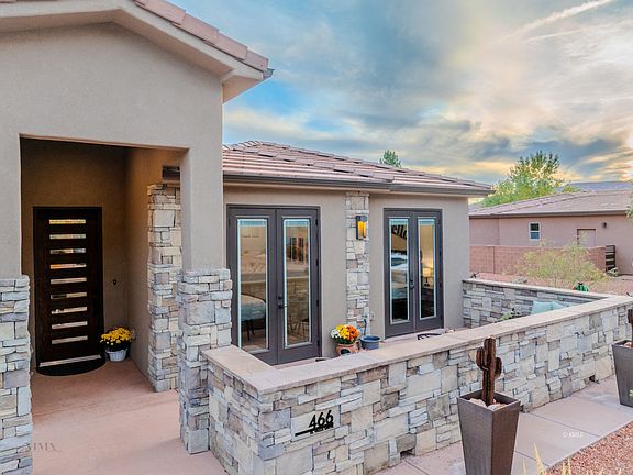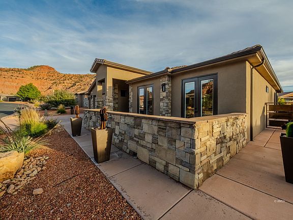 Modern Desert Elegance in La Estancia: Discover refined desert living in this impeccably designed single level home featuring 3 bedrooms, 2 bathrooms, and a 3-car garage in Kanab's premier La Estancia community. Every detail reflects quality craftsmanship, sophisticated finishes, and the beauty of Red Rock surroundings. Custom mosaic tile, 8-ft solid wood doors, designer lighting, and ceiling fans complement the home's modern desert aesthetic. The spacious great room showcases oversized windows framing mountain views and a sleek electric fireplace, while the open kitchen offers a large custom island, Bosch appliances, quartz countertops, solid wood cabinetry, and a walk-in pantry. The private primary suite features dual sinks, a walk-in shower, and a generous dressing room. Each bedroom has outdoor access, with guest rooms opening to a tranquil courtyard. Landscaped yards include pet friendly turf and mature plantings. Fully furnished with limited exclusions, this all electric home offers luxury, thoughtful design, and modern desert elegance.