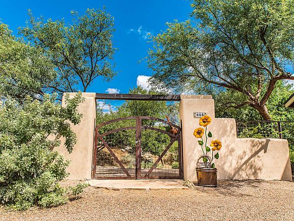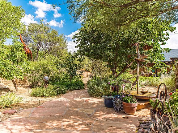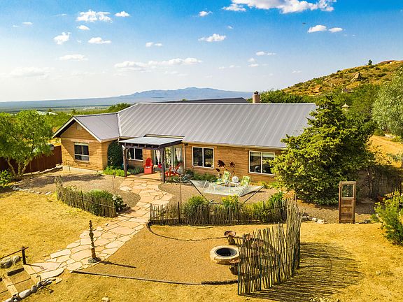 RARE OFFERING! Rammed earth custom home provides the setting for a gardener's paradise, on one acre with BREATHTAKING views in all directions! This is not just a home, but a lifestyle. Nestled in an area of custom builds, the beauty and warmth of this estate hits you the moment you enter the garden gates. Lush vegetation including apple, peach, and Asian pear trees amidst an array of other greenery. Situated in the front of the yard is the custom chicken coop. Garden paths lead in all directions, including the front covered porch to take in the garden views. The home boasts brick floors throughout, 24'' thick walls for exceptional insulation, vaulted wood ceilings, and all the organic charm you expect from a rammed earth home. The floorplan is open and spacious and has a split bedroom floorplan as well as a wall of windows to bring in the light and showcase the magnificent mountain views! There is a freestanding 204 sf studio/office (heated, cooled, internet), custom greenhouse, rainwater harvesting, newer metal roof, new HVAC and the list goes on! This one of kind home will not disappoint. Must see to appreciate.