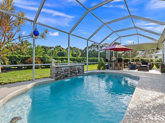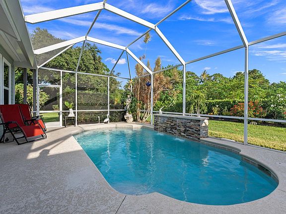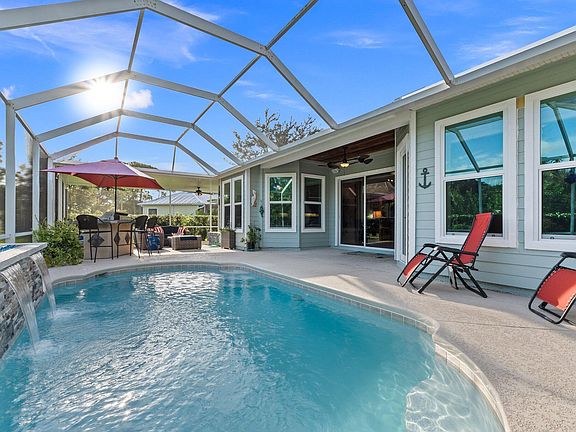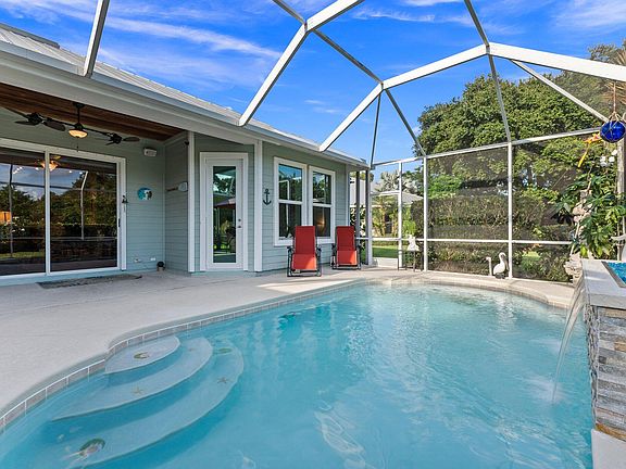 Welcome to your slice of paradise! This charming 3-bed, 2-bath Key West-style pool home in the desirable River Place has everything you need to enjoy the perfect Florida lifestyle. This home has all the upgrades you could want! Inside: new AC (2023), impact windows (2024), Stainless Steel appliances (2019). Outside: zoned sprinkler system (2024), heated saltwater pool, resurfaced (2022) with a sheer waterfall, color-changing lights, and a cozy fire pit perfect for entertaining. The extended patio and screen enclosure invite year-round outdoor living, along with an outdoor kitchen & fire-pit. The 5 mounted TVs are also included.River Place on the St Lucie also offers nature trails, a kayak & canoe launch, a private boat ramp, clubhouse, gym, and pool. Don't miss out on this gem!