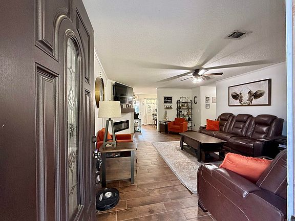New electric fireplaceGranite countertopsTile backsplashPorcelain tile plank flooringKitchen cabinets