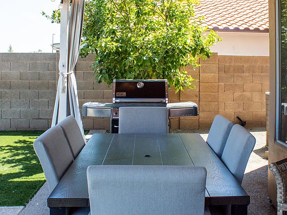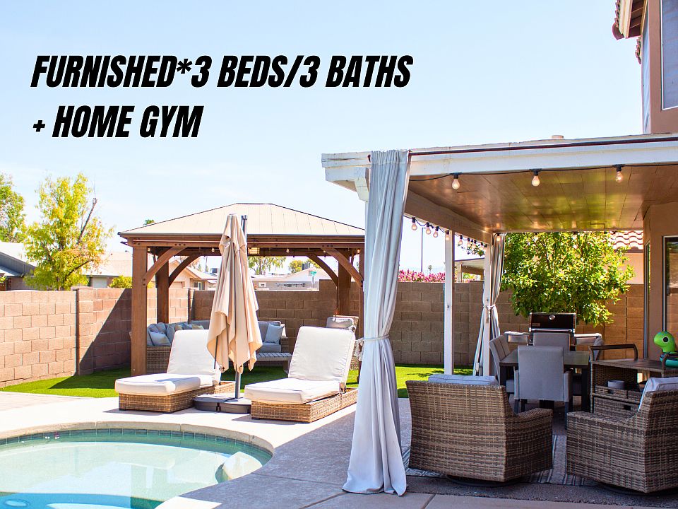 +Furnished rental +Open to extensions +Month to month or Long-term rentals available PROPERTY +3 beds/3 baths + 1 home gym +Pool/Firepit/Weber grill/Turf lawn/dining table for 6 +1 King bed, 1 Full, 1 Queen +3 Bedrooms +3 Bathrooms (include soaking tub that fits 2 + a rain shower) +Gym with bands, weights, peloton, treadmill, TV, mirrors,etc.) +2 Garage spaces +3 Driveway spaces +Fireplace +Outdoor dining area with fan + lights +Ninja + Whirlpool appliances +Central AC +Fully fenced +Peloton LOCATION +1 block to groceries (Frys) +8 blocks to restaurants/retail and farmer's market (Saturdays starting at 7AM) +3 mi to Trader Joes/Whole Foods +3.5 mi to Hwy and Interstate +5 miles to SanTan Village Industries +3 miles to Northrup Grumman +5 miles to Isagenix +8 mi to hospitals +11 mi to Intel HQ +16 mi to ASU Tourism +18 mi to Airport +45 minutes to Lakes +18 mi to Zoo Other Cities +2.5 hours to Flagstaff +2 hours to Sedona +29 mi to Scottsdale + Anyone 18+ staying in the unit for 10+ consecutive nights must be disclosed to the landlord +The weight, name and breed of any animals must be disclosed to the landlord before the animal is in the home +No glitter in the property +Tenant responsible for replacing light bulbs, batteries and paying all locksmith costs +Per AZ law, landlord may enter unit if they provide 48 hour snotice