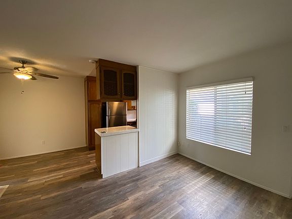 As you enter into the living room you will find warm modern paint colors and plank flooring. The living room is spacious and allows for full size furniture. There are built ins for books, decor or more.