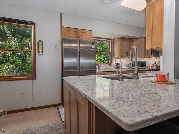 This beautiful 2 bedroom, with the potential for a third, 4- level split level home offers comfort, style and functionality. The main level features an inviting open-concept with cathedral ceilings in living room, dining room and fully renovated kitchen - complete with soft-close cabinets, pull-out cupboards, lazy Susan, beautiful quartz countertops, an extra deep sink,under cabinet lighting and a breakfast bar with seating for two. A convenient half bath is located on the main level, while the upper floor boasts a gorgeous full bath with skylight and a relaxing garden tub, new double sinks with new quartz countertops and new shower. Both bathrooms offer pull out cabinets. The spacious primary bedroom connects directly to the main bath and offers 2 extra-deep double closets plus amble space for a reading nook/workout area or hobby corner. The lower level features a cozy family room with a ventless gas fireplace and sliding door access to a covered patio and two-tier deck overlooking a park-like backyard. The basement includes a laundry area that can double as a home office or creative workspace. The attached garage has built in cupboards with a work bench and a small side deck off of garage door. Gutters have gutter guards. With its thoughtful updates, flexible layout and outdoor living spaces, this home is move-in ready and prefect for both relaxing and entertaining.