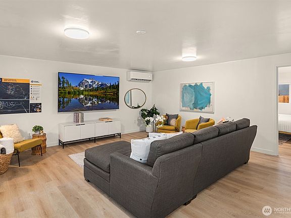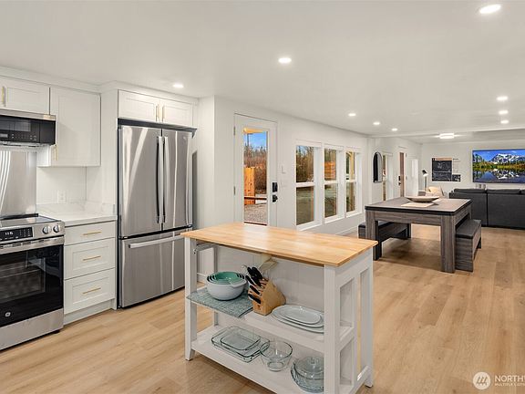 Beautifully remodeled 3 bed/1.75 bath home in Darrington with mountain views, near the North Cascades with endless hiking opportunities. Features include LVP flooring throughout, a spacious primary suite with double vanity, quartz counters, tile shower and floors. Two large bedrooms share a stylish full bath. The kitchen boasts shaker cabinets, quartz counters, and stainless appliances. Finished 672sf garage with LVP and glass sliders makes a perfect rec room. Mini splits for year-round comfort. Studs-out remodel includes new windows, doors, insulation, and roof, as well as new plumbing and electrical throughout. Fully fenced yard, detached carport with RV hookups. Offered furnished or unfurnished.