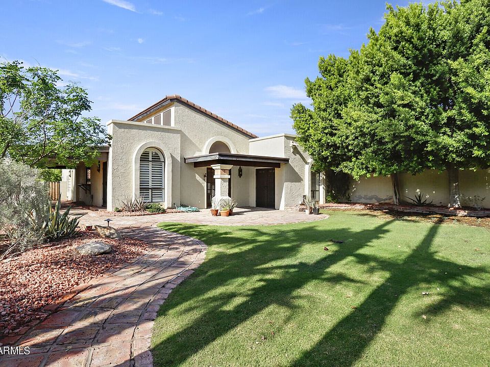 Fantastic location within Ahwatukee's coveted Pointe South Mountain Area. This area is so lush! This 1-story home boasts a premium expansive lot backing up to golf course with mountain views. The backyard and side yard are so beautiful and green; perfect for entertaining and relaxing. Absolutely gorgeous and charming home with character, vaulted ceilings, exposed wood beam, a beautiful kitchen with courtyard views, living room with cozy fireplace, large master with French doors exiting into tranquil backyard, and an oversized 2nd bedroom. Lots of character! As soon as you walk in you will see that it has plenty of natural light and is fresh-n-clean. New interior paint on the walls, cabinets, doors, trim, and ceiling. New carpet too. The community pool is super close.