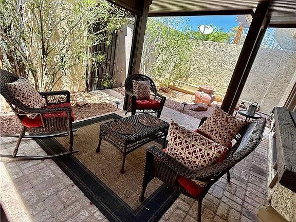The perfect location just within a few steps from club house and sparkling pool and Spa. This immaculate home offers a wonderful layout and has been perfectly maintained throughout the years. This unit has a beautiful patio with alumna wood cover and it accesses the garage with an automatic garage door. The interior boasts pride of ownership with plantation shutters on every window and a new French door which leads to the lovely patio. The primary bedroom is separate from the secondary bedrooms and has a beautiful balcony.