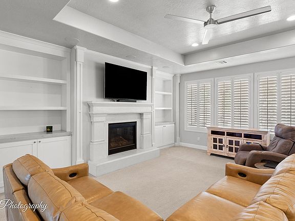 This home has a great layout with an open concept floor plan featuring a large living area with built in shelving, fireplace, along with an oversized island, plenty of kitchen shelving, soft closing drawers, upgraded appliances & dinning area.