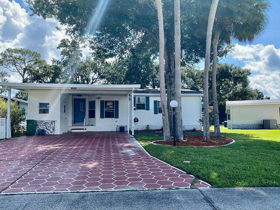 This is a LOVELY updated 2 bedroom 2 bath split plan home on Leased land in the 55+ adult park of Island Lakes, in Merritt Island Florida ! The Current monthly Lot rent of $611 includes basic cable, trash /recyclable pick up and use of all park amenities. Pets allowed with approval. Rentals permitted. New occupancy rates will apply in 2022. See park office for details and for park application information. * * Enjoy the gorgeous scenery this home's location offers. This peaceful backyard is a great spot to relax or start up the BBQ * * FEATURES : -Home and park are in a Great Location in Merritt Island Florida. Close to Kennedy Space Center, Port Canaveral cruise terminals, Cocoa Beach, Dining and shopping. -Island Lakes is a gated 55+ adult park with plenty of amenities and activities; clubhouse, pool, fitness room, pool table, library. -Special, quiet and peaceful backyard with views of nature from the back screened porch with updated carpet. -Shingled roof, carport/patio, large colorful driveway with plenty of parking. -AC approx. 10 years of age , all NEW duct work installed. -Entire home has re-piped with added water heater. -8 x 10 Back Shed for storage /laundry. Washer and dryer included. -9.5 x 14 front shed for storage/ workshop. -Home exterior recently pressure washed. -Landscaping updated to include fresh mulch, plants and shrubs. Weeded and sprayed. Trees and shrubs trimmed. -Full house pest treatment with Pest company preventative scheduled quarterly . FEATURES INSIDE: -All NEW Vinyl plank flooring installed throughout the home. -Home interior has been repainted including kitchen and master bathroom cabinets, including updated hardware. -All appliances as photographed will remain in the kitchen with a NEW Stove/Oven. -Master Bedroom Furnishing will remain as photographed. -NEW Window treatments will remain. All listing information is deemed reliable but not guaranteed and should be independently verified through personal inspection by appropriate professionals. We do not and cannot guarantee or warrant the accuracy of this information or condition of this property. Measurements are approximate. The buyer assumes full responsibility for obtaining all current rates of lot rent, fees, and pass-on costs. Additionally, the buyer is responsible for obtaining all rules, regulations, pet policies, etc., associated with the community, park, or home from the community/park manager. We are not responsible for quoting of said fees or policies.