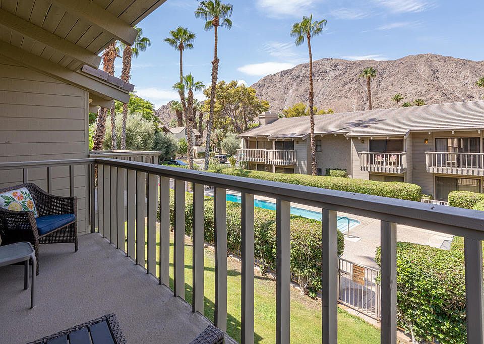Step into resort-style living in this sophisticated 2-bedroom, 2-bath condo within the gated Mountain Cove community. Enjoy an open floor plan with vaulted ceilings and three private balconies that seamlessly blend indoor-outdoor living. Savor breathtaking southwest-facing mountain and sunset views from the main living room, primary bedroom, and balconies.Partially furnished for your ease, this home is primed for entertaining and relaxation. The primary suite is a luxurious retreat with a walk-in closet, updated bath with dual vanity and custom-tiled shower, and a private balcony overlooking the pool and mountains. A guest suite with its own bath ensures comfort for visitors, with both bathrooms elegantly renovated.Enjoy exclusive Indian Wells resident discounts on golf, dining, and local amenities, just minutes from world-class tennis, golf, shopping, and dining. With a 30-day minimum rental policy, this condo offers flexibility for part-time residence and rental income potential.