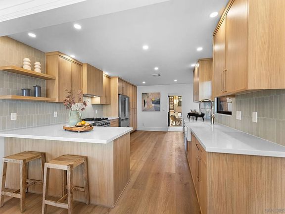 Timeless charm meets modern luxury in this beautifully renovated 4-bed, 2.5-bath 1923 Craftsman — complete with a fully equipped 1-bed, 1-bath back house ideal for multigenerational living, a home office suite, or private guest quarters. Located in one of San Diego’s most beloved historic neighborhoods, this property offers exceptional walkability and immediate access to University Heights’ vibrant restaurant, bar, and retail scene. The main home blends thoughtful upgrades with preserved character throughout, including original wood windows, stained-glass details, and classic Craftsman architecture. With strong potential for historic designation, the home offers both charm and long-term value. Inside, the renovation showcases custom cabinetry, high-end designer tile, and elevated finishes. The oversized primary bathroom is a true retreat, featuring a single oversized dual-sink vanity, a large walk-in shower with dual shower heads, a private water closet, and champagne bronze fixtures. The primary suite also includes a custom built-out closet for refined, functional storage. The flexible layout includes a front bedroom that works perfectly as a dedicated office or creative studio. The property’s outdoor amenities are designed for quintessential San Diego living, offering a sparkling pool, a custom extruded-aluminum pergola, and a multifunctional rear flex space ideal for parking, lounging, or entertaining. A detached 2-car garage and alley access further enhance usability — and present a compelling opportunity for future value add through additional units or ADU expansion