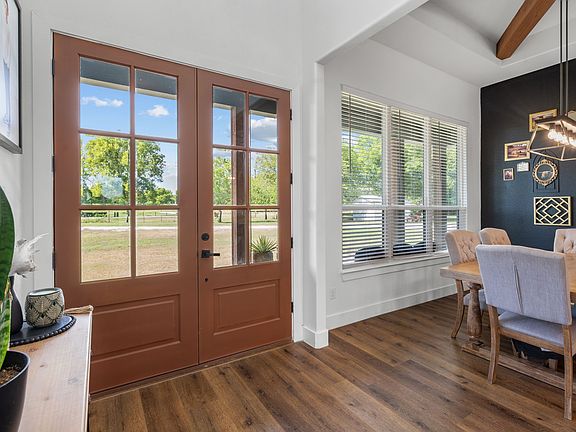 If you've been dreaming about luxurious living set against a peaceful country backdrop- this is the one! From the moment you arrive, you are greeted by a stunning black home that sits quietly on just under 3 acres, plus a renovated mobile home that together seamlessly blends bold design with peaceful, wide-open spaces. The main home offers 4 BD 3.5 BR with 2482 of space. With tall ceilings that capture the attention right away, to the exposed beams in the dining and living room, to the massive 12-foot iron sliding glass doors that stack open to create seamless indoor-outdoor living. And as if that isn't enough, the kitchen is just as dreamy. This kitchen showcases black and white calacutta quartz countertops with large center island, Z line appliances, gold accents, and plenty of storage space- not to mention custom cabinetry for pots, pans, spices, and utensils. The primary bedroom is oversized, and features a black accent wall. The primary bathroom is outfitted with his and hers vanity, large walk in shower with 3 body jets, hand sprayer& large top sprayer and also features a master toilet with bidet, water sprayers, dryer and light. If you need an office or dedicated play room- this home also provides the space. With barn door and decorative wall, whatever your needs are, this home can accommodate. From the natural wood posts framing the oversized covered porch to the high-end finishes inside, the oversized covered back patio- every detail is thoughtfully crafted.The second home is a mobile home that has been renovated, featuring 3 BD and 2 BR with 1232 sq ft. Updates include new flooring, new exterior and interior paint, new roof, new ac unit, and new toilet and vanity in the secondary bathroom. Perfect for multi generational families, or income producing opportunities. If you're looking for room to roam, space to breathe, and a home that turns heads, this is a rare mix of style, space, and seclusion—this is Texas living reimagined.