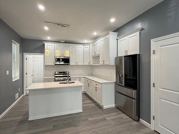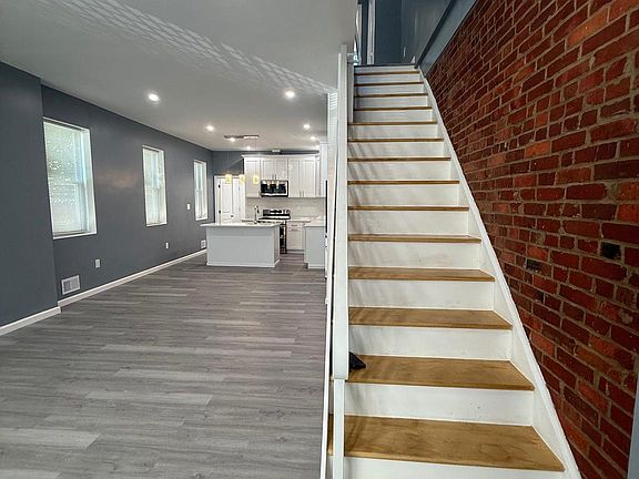 Welcome to this beautifully renovated 3-bedroom, 1.5-bathroom home featuring modern finishes and spacious living. Step inside to an open-concept layout with new flooring, recessed lighting, and a stunning exposed brick accent wall that adds character and charm. The heart of the home is the fully updated kitchen, complete with white shaker cabinets, quartz countertops, tile backsplash, a center island with sink, pendant lighting, and brand-new stainless steel appliances. Upstairs you’ll find three oversized bedrooms, each with ample natural light, along with a modern full bathroom showcasing sleek tile work, a double vanity, LED mirror, and a glass-enclosed shower. The first floor also features a convenient half bath for guests.