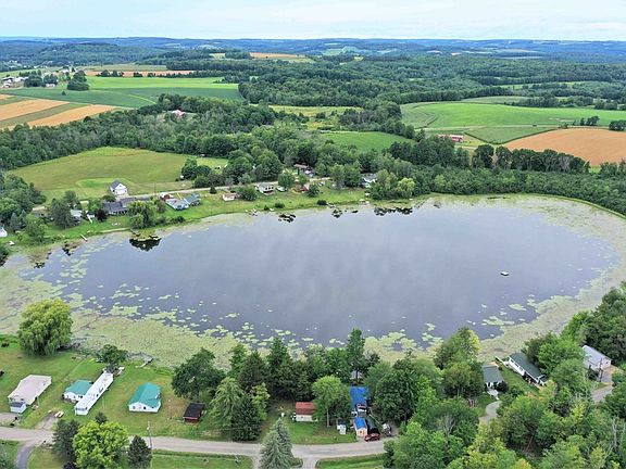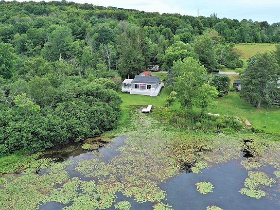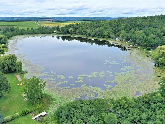 Beautifully maintained cottage overlooks the private lake and is situated at the end of the paved road. Take advantage of single story living in this 2 bedroom home with a large wrap-around deck. Kitchen features bright white cabinets and a nice sized dining area. Fully renovated in 2015 including a newer roof, updated electric, and new plumbing throughout. Spacious living area with a sliding glass door leading to the deck overlooking the lake. Main bedroom has a knotty pine ceiling and a second sliding glass door leading out to the deck. 2nd bedroom and an extra room utilized as an office with a convenient space for laundry. Full bathroom has linoleum tile floor and a shower with a full tub. 2 propane Rinnai high-efficiency heaters provide a reliable source of heat for the year-round residence. Large deck wraps around the home overlooking the water and has an additional screened sitting area. Large carport for parking and ample storage is provided by two outbuildings in excellent condition. Loucks Pond is a private lake, nearly 20 acres in size with no public access or power boats permitted. Along the 50 ft. of waterfront is a removable aluminum dock that will be included.