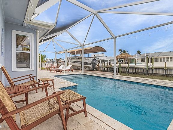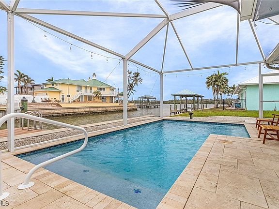 Welcome to your ideal waterfront paradise! This stunning beach house boasts breathtaking views of the canal and bay, perfectly positioned on an expansive 80 FT wide lot. Tucked away in a peaceful cul-de-sac, this remarkable property seamlessly combines serenity with coastal charm. Recent enhancements include a NEWER SEAWALL, a sparkling NEWER POOL, and a NEWER BOAT DOCK/LIFT, all completed in 2020, providing everything you need for a life of leisure on the water. The property's prime location offers partial bayfront vistas and convenient access to the canals, making it a dream come true for boating lovers. - Recent exterior upgrades include: HVAC system, pool heater, pool pump, screen enclosure, irrigation system, and fresh landscaping. - Interior improvements feature: Impact windows and sliding doors, modern cabinets, stylish countertops, upgraded appliances, elegant tile showers, contemporary vanities, and beautiful tile flooring. - Cozy fireplace for those cooler evenings. - Fully furnished with all brand new furnishings! - Great potential for investment or rental income. - Spacious layout, making it one of the larger 2-bedroom, 2-bath options available. - Versatile bonus room that can be utilized as a den or office. Picture yourself enjoying spectacular sunsets over Fort Myers Beach, taking peaceful strolls along the shore, and embarking on leisurely boat rides right from your own backyard. This isn't just a property; it's a lifestyle beckoning you to embrace it. Seize the opportunity to create your personal oasis in this beautiful coastal environment!