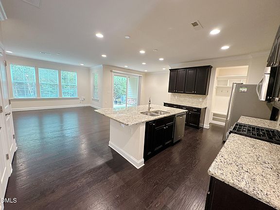 This bright and welcoming 3-bedroom, 2.5-bath home spans 2,214 square feet and showcases the sought-after Bradon floor plan. Upon entry, you're greeted by soaring ceilings, expansive windows, and gleaming hardwood floors that create an airy, inviting atmosphere. The open-concept design connects the family room to the dining area and a sleek modern kitchen. The kitchen features rich brown cabinetry, stainless steel appliances (microwave vented outdoors), a gas range, a spacious island with seating for four, and a charming coffee nook. Upstairs, the versatile loft provides an ideal space for a home office, play area, or reading retreat. The primary suite feels like a private sanctuary, complete with a generous walk-in closet, dual-sink vanity, soaking tub, separate shower, and private closet. Two secondary bedrooms—each with its own walk-in closet—share a full bath equipped with double vanities and a tub/shower combination. Recent updates include whole house fresh painting, 2022 washer, the washer & dryer set conveys. Additional highlights include a two-car garage, a private backyard with an open patio ideal for relaxing, grilling and entertaining. Perfectly positioned near top-rated Davis Drive Elementary & Middle Schools, with Morrisville Elementary (year-round) as an alternate base and Green Hope High School as base high school. This home is located in the heart of Cary (close to high house road) and thus offers exceptional convenience. Enjoy quick access to everyday essentials with Harris Teeter, Hmart, Publix, Wegmans, Costco, and numerous restaurants just minutes away. A wonderful blend of comfort, elegance, and location—schedule your visit today!