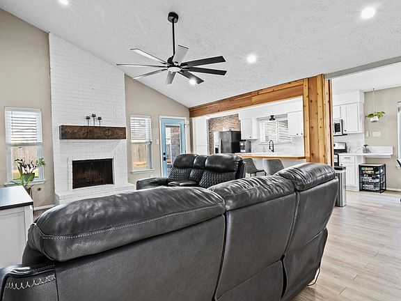 Step inside to a beautifully updated kitchen featuring crisp shaker cabinets, quartz countertops, a butcher block island-style bar, stainless steel appliances, and a washer, dryer, and refrigerator all included. This well-maintained three-bedroom, two-bathroom home offers an open floor plan with vaulted ceilings, creating a bright and spacious living area centered around a stunning white-brick fireplace and custom mantel. The home is loaded with upgrades, including new AC, new energy-efficient windows, new hardwood floors in all bedrooms, new light fixtures, and new ceiling fans in the living room and bedrooms. The primary suite features a newly remodeled bathroom with a double vanity, marble tile, frameless glass shower with dual shower heads, and a large walk-in closet with built-ins.