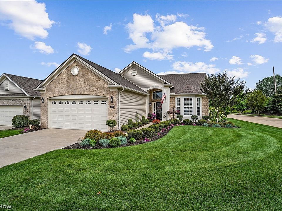 A villa-style ranch home with 3 bedrooms, 2 full baths and an open floor plan that offers a beautiful and comfortable living space. The kitchen with white cabinetry, granite counters, tiled backsplash, stainless appliances, under the cabinet lighting and an eating bar providing a modern and functional area. Hardwood flooring throughout the main living area provides an attractive look. The great room offers a gas fireplace. There is a dining area that is large enough for a big dining table. A sitting/sunroom extends off of the dining area and provides an inviting space for relaxation. Spacious laundry room with washer and dryer included. The split floor plan offers the owner suite on one side with an ensuite bathroom containing double sinks, shower and a walk in closet. Two other bedrooms and a full bath are perfect for family or guests. The home has plantation blinds throught. You will love the outdoor patio area with a stamped concrete patio with a built in firepit. There is a Sunsetter awning that actually will close by itself if the wind picks up. Extensive landscaping around the patio makes it a nice seculded place to relax or entertain. This home is only 6 years old and sits in the beautiful Stonebridge Crossing Development. An added feature in the garage is a staircase that leads to a storage area above the garage (no ladder to pull down)! This home is in impeccable shape. If you are looking to down size a bit but still want the ability to garden in your yard but not mow, then you will love it here!