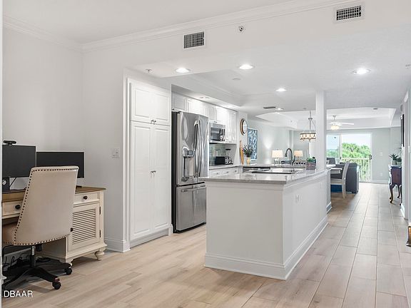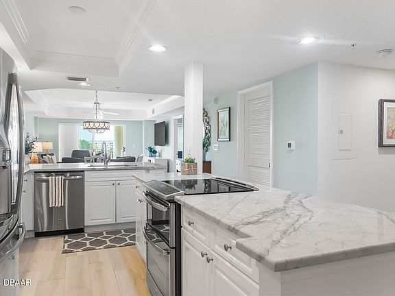 Enjoy the Harbour Village Lifestyle and All That it Has to Offer! Links Village South is a Gated Community, Located in Ponce Inlet, Nestled Between the Intracoastal Waterway and the Atlantic Ocean. Featuring 9-Hole Golf Course, Tennis Court, Indoor and Outdoor Pools, Sauna, Social Rooms, Fitness Center, Oceanfront Clubhouse, Marina, and So Much More Included in Your Quarterly HOA! This 2-Bed, 2-Bath Unit Features Porcelain Plank Tile Floors and Crown Molding Throughout. Open Concept Living, Kitchen Features White Cabinetry, Stainless Steel Appliances, Quartzite Counters Tops, Breakfast Bar, Pantry and Glass Tile Backsplash. Open to Dining and Living Room with Direct Access to Your Private Balcony Overlooking the Golf Course with Breathtaking Sunsets Views. Split Bedrooms, Master with Ship-lap Focal Wall, Direct Walkout to Balcony, Walk-in Closet. Master Bath Features Quartzite Counter, Shower and Soaking Tub. Guest Bath with Granite + Satin Nickel Fixtures. In Unit Laundry, Tankless Hot Water Tank. The Condo Comes with Assigned Parking, Storage Unit, Bike Storage additional Storage on Each Floor. This Pet Friendly Community Is close to Ponce Inlet's Lighthouse, Museums, Restaurants, Marinas, Bike Paths and So Much More! What are you waiting for? Schedule Your Private Showing Today! Centrally Located Between Orlando and Jacksonville. Easy Access to All Local Attractions and Orlando Theme Parks. Square footage received from property appraiser records. All information is deemed correct but not guaranteed. Buyer(s) must verify all measurements & information for themselves.