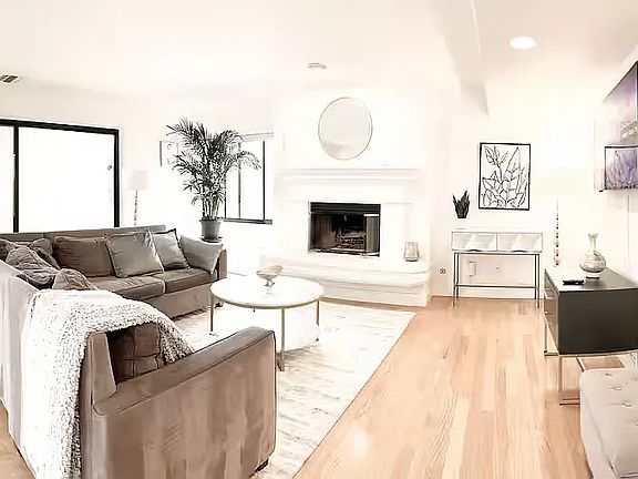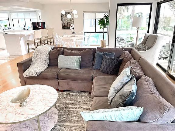 Step into this sun-drenched retreat featuring soaring ceilings, rich hardwood flooring, and an expansive open floor plan. The designer-furnished interiors include a spacious living room, formal dining area, and a gourmet kitchen with stainless steel appliances, granite countertops, and a large island perfect for cooking or entertaining.