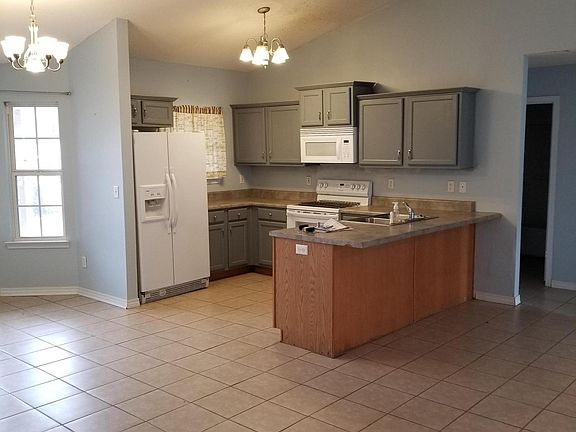 Open floor plan with vaulted ceilings, Kitchen/Dining area. Master suite with full bathroom. 2 bedrooms and full bath off Living area. Tile floors throughout, inside laundry room off garage. Flat lot with 1 car garage. House needs some TLC but would make a great home.