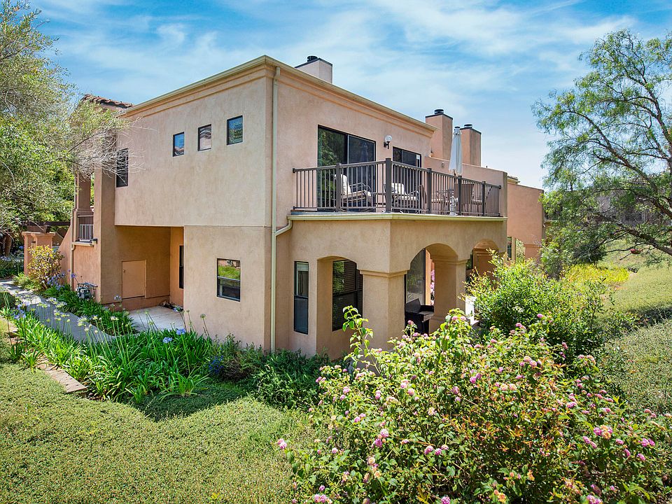 Welcome to Forte Ranch, nestled in a quiet community lies a move-in ready condo with 2 bed, 2 bath plus an office, that can be converted to a 3rd bedroom. This end unit offers 1,616 SF and lives more like a single-family home. Follow the front stairs up to a gorgeous entry, updated kitchen and open living area with high ceilings, newer wood floors and cozy fireplace. The primary suite boasts a walk-in closet, shower, bath, and dual vanity. Enjoy the tranquil balcony/patio with beautiful views of lush trees and landscaping. The attached two-car garage has plenty of storage. Soak in the resort-style development which offers a pool, 2 spas, play area and gardens.