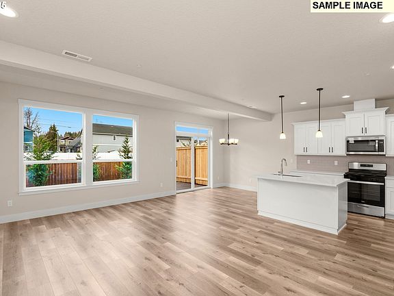Two-car side-by-side garageGas fireplaceFenced yardMatte black hardwareFront landscaping with sprinklersWide-plank laminate flooringSoft-close cabinetry
