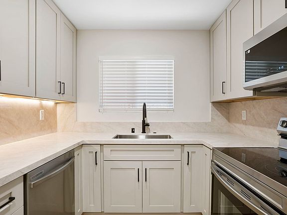 The chef's kitchen boasts taupe shaker cabinetry, quartz countertops, and full-size stainless steel appliances. A spacious peninsula provides the ideal spot for casual dining or entertaining with seating for two.