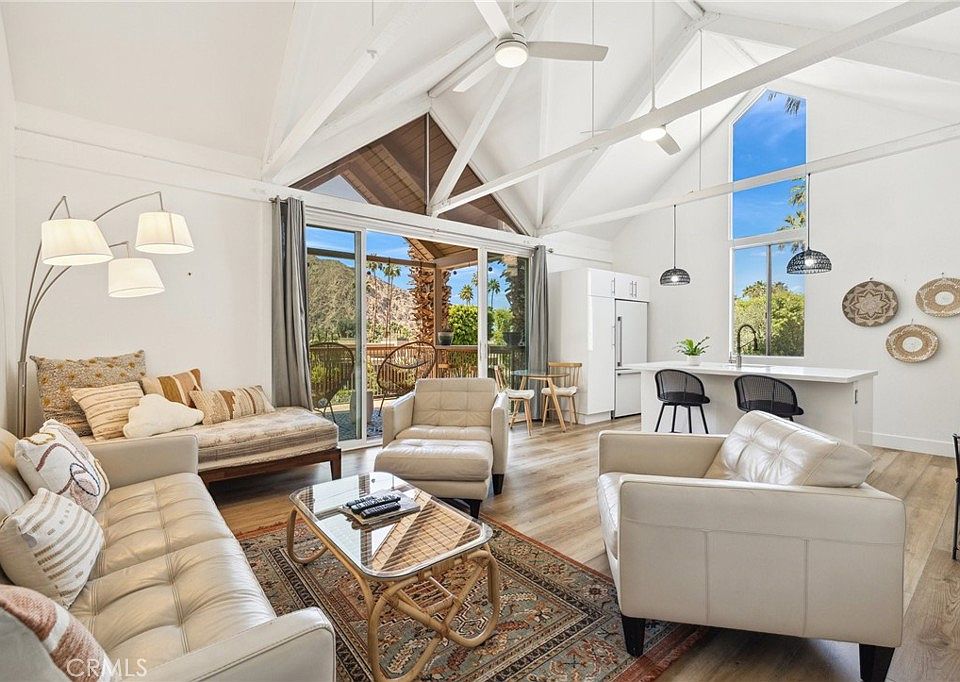 Welcome to resort style living tucked in the scenic mountains of Indian Wells. This adorable recently updated modern 2 story condo is located in the desirable Mountain Cove community. As you step inside, high ceilings frame breathtaking mountain views through the patio slider, creating an immediate sense of tranquility. The porch slider opens up in both directions to bring the outside in. The unit boasts a new fridge, backsplash, counter top sink, and new flooring upstairs. Both king size bedrooms downstairs feature sliding doors opening up to your own private patio. The downstairs bathroom has been fully remodeled. A stacked washer and dryer, central heating, and air conditioning enhance convenience. Enjoy access to a community pool just steps away.